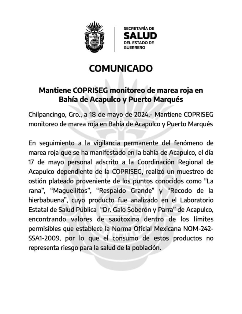 En seguimiento a la vigilancia permanente del fenómeno de marea roja que se ha manifestado en la bahía de Acapulco, el día 17 de mayo personal adscrito a la Coordinación Regional de Acapulco dependiente de la COPRISEG, realizó un muestreo de ostión plateado proveniente de los puntos conocidos como “La rana”, “Maguellitos”, “Respaldo Grande” y “Recodo de la hierbabuena”, cuyo producto fue analizado en el Laboratorio Estatal de Salud Pública “Dr. Galo Soberón y Parra” de Acapulco, encontrando valores de saxitoxina dentro de los límites permisibles que establece la Norma Oficial Mexicana NOM-242-SSA1-2009, por lo que el consumo de estos productos no representa riesgo para la salud de la población.